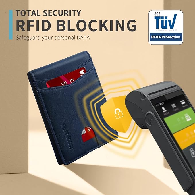 • RFID Blocking - Our wallets are equipped with advanced RFID SECURE Technology, a unique metal composite, engineered specifically to block 13.56 MHz or higher RFID signals and protect the valuable information stored on RFID chips from unauthorized scans. License and ID cards will be protected effectively. Blocking the 13.56 MHz band and protect against data theft by RFID scanners
