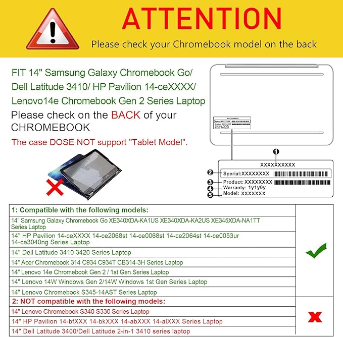 - WARNING: The case is NOT compatible with 14 inch Lenovo Chromebook S340 S330 Series Laptop, 14 inch HP Pavilion 14-bfXXX 14-bkXXX 14-abXXX 14-alXXX Series Laptop, 14 inch Dell Latitude 3400, 14 inch Dell Latitude 2-in-1 3410 Series Laptop.