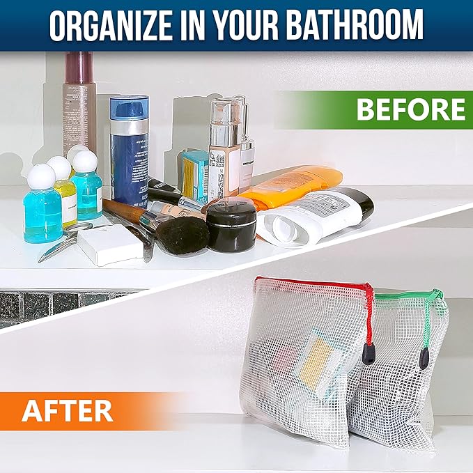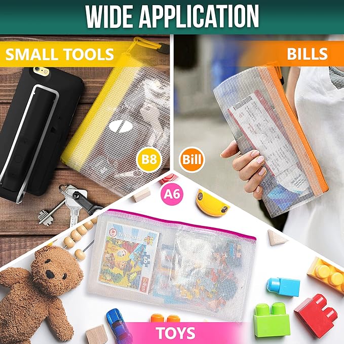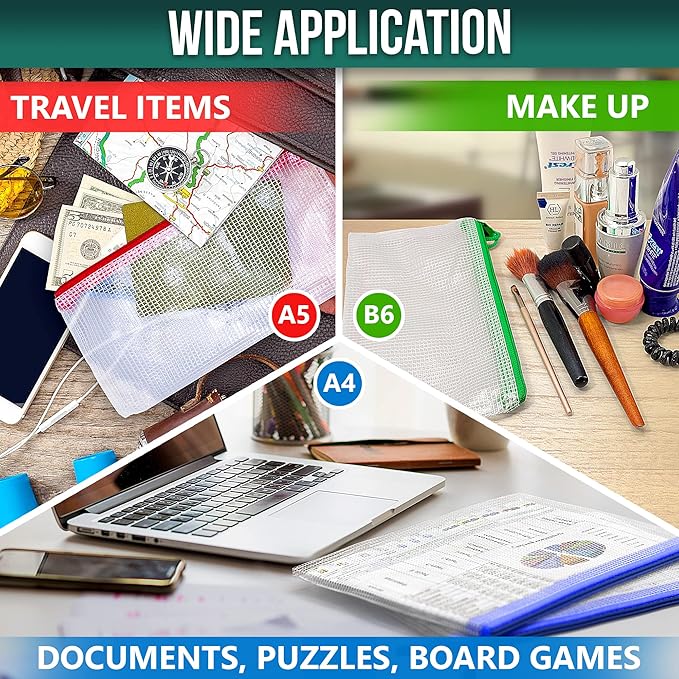 - ☑️ Package includes: 16 mesh zipper bags. A4x4, A5x4, A6x2, Billx2, B6x2, B8x2, Different colors for better sorting your items.