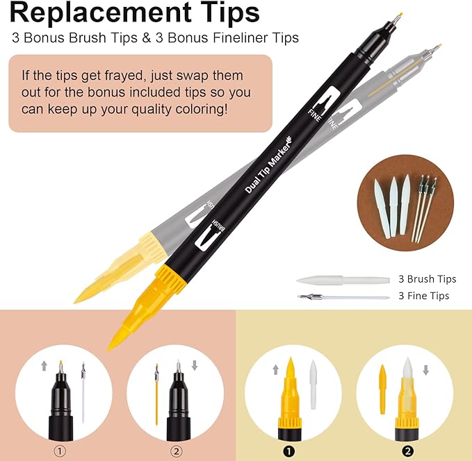 - PACKING LIST: 1 x Portable Case, 72 x Coloring Markers, 1 x DIY Coloring Book, 3 x Bonus Brush Tips & 3 x Bonus Fineliner Tips.The coloring markers are packaged in a durable and attractive case, offering enhanced protection for the pens during transportation. The built-in elastic cord secures the dual brush marker pens in place, making them convenient to carry, the outer zipper with stitching is easy to open and close