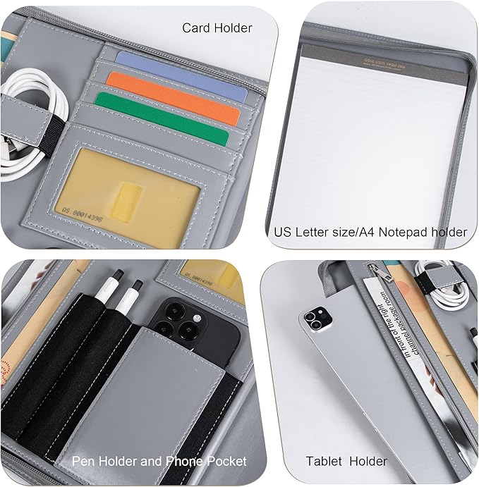 - INNOVATIVE STORAGE-This leather portfolio both for men and women has excellent functionalityand practicality. Elaborately crafted gray leather padtfolio with useful features including 2 pen holders, an adjustable phone pouch, 5 business card holders, letter-size notepad/legal pad/ notebook holder, a large zipper pocket, document pockets plus a 13-inch ipad/tablet sleeve.