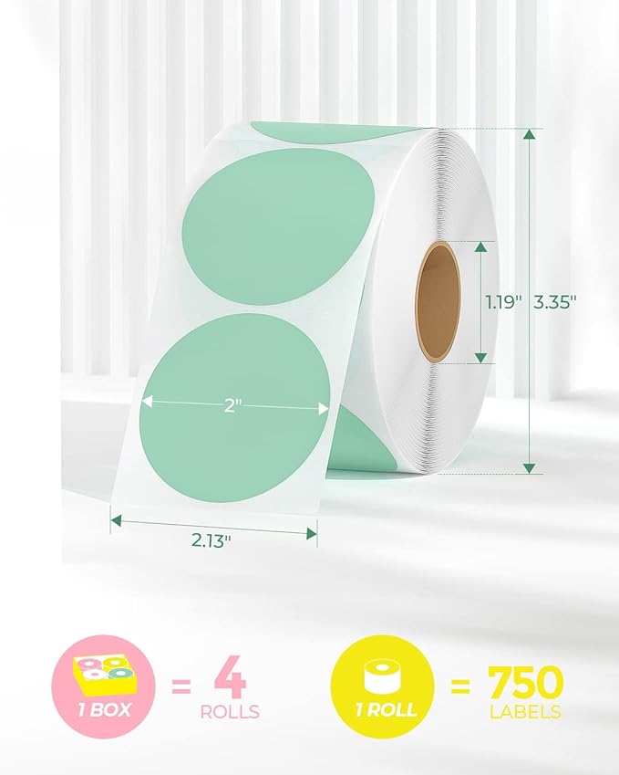 - Munbyn Generic Circle Series Labels (GR): Round thermal sticker with the size: 2" circle (750 Labels/Roll, 6 Rolls), No ink toner or ribbons needed!