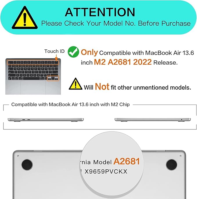 • Only compatible with MacBook Air 13.6 inch / Model A2681, M2 chip, Liquid Retina Display, 2022 Release.(Please refer to image 3)