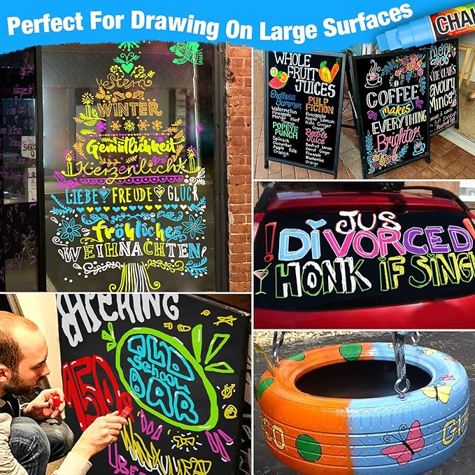 - 【Purchase without Risk】Your satisfaction is our number one priority. If you don't feel satisfied with your auto markers, please simply contact us and we will solve all your chalk car window paint markers concerns within 24 hours. This jumbo chalk markers for cars also can be a perfect gift for your family, neighbors or friends on Birthday, Party, Anniversary, Halloween, Thanksgiving, Christmas or New Years