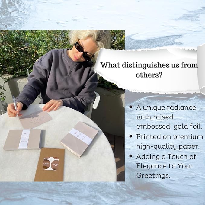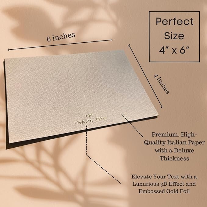 - HIGH QUALITY MATERIAL - Solid and high end finish with 320 GSM Italian thick textured paper card embossed gold foil pressed. Non-glossy paper, means no fingerprints or scratches when handling these thank-you cards. Will not smudge or smear.