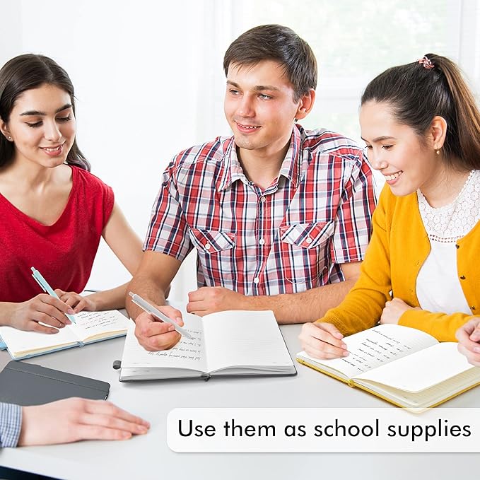 - 3 different solid colors for these notebooks, Gray, Yellow and Light Blue. There are 3 Black Retractable Pens in the box. You can use it as soon as you receive it. These pens are perfect to be put in the pen holder of the classic ruled notebook. Large tube has the capacity of restoring more ink, which makes them long lasting. Quick drying can avoid smearing and smudge.