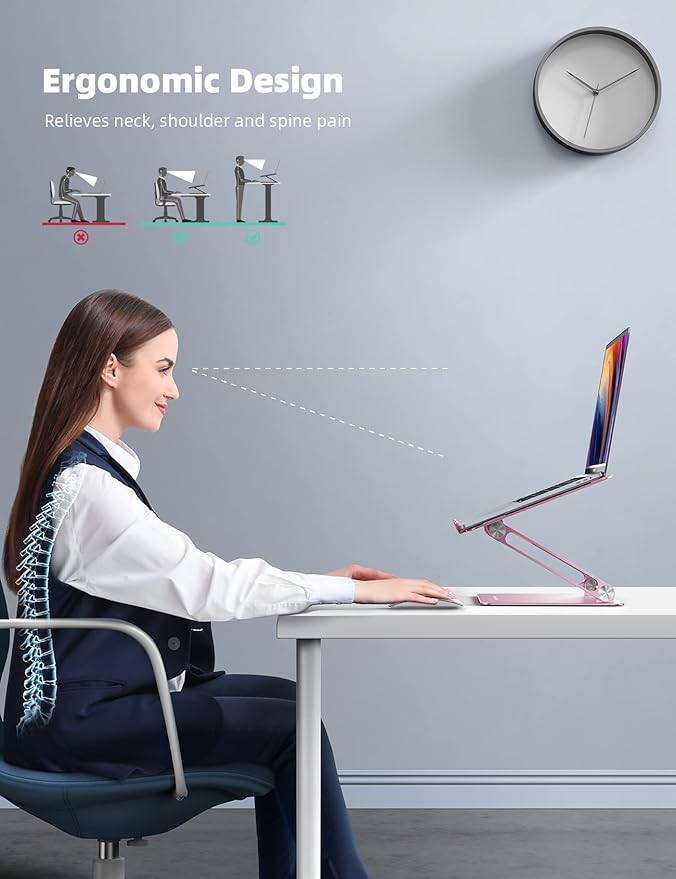 - Ergonomic Design: The MacBook air pro stand holder works as a raiser to elevate the laptop screen to your eye level. The office computer stand let you fix posture and relieves neck, shoulder and spinal pain, it's very comfortable for working at home, office and outdoor, make typing more easier.