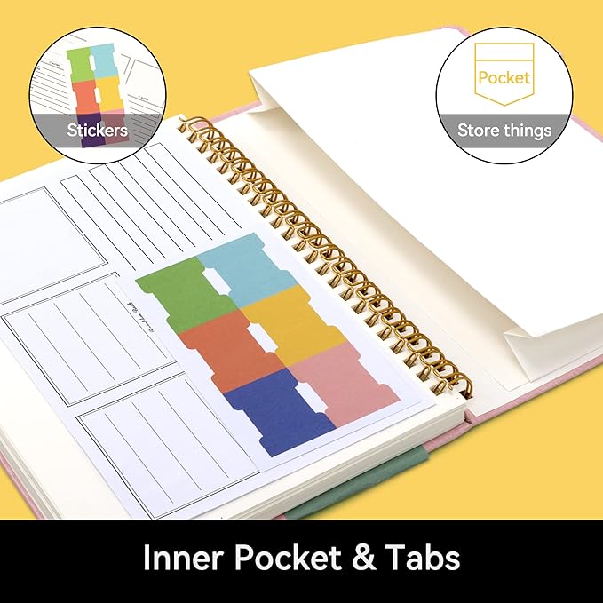 Alltree Lined Journal Notebook, Hardcover Spiral Notebook for Work, Hardcover Spiral Notebook with Tabs, Pen Loop, Pocket, Stickers, 160 Pages, Journal for Women & Men, Pink(6"x8.5")
