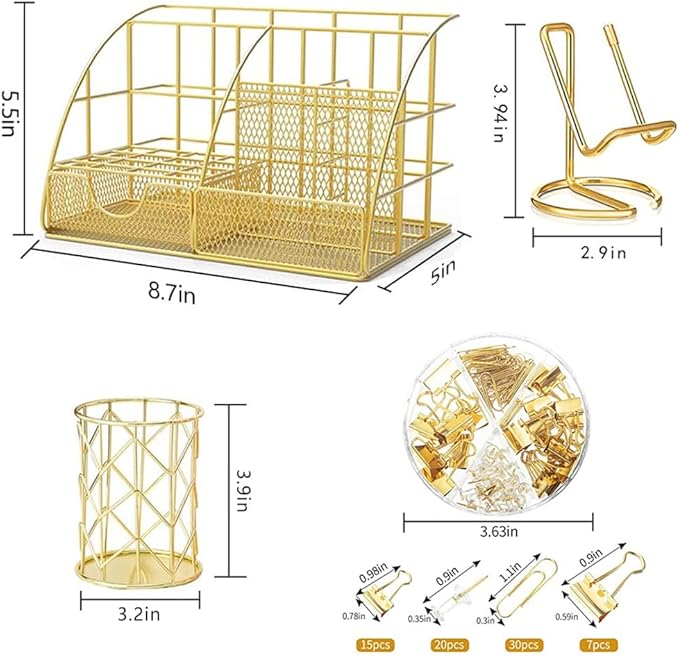 - 【Organizers and Accessories】You will get a set of delicate office organizers and supplies, including a desk organizer, a Pen Holder, Phone Stand and 72 Clips Set. If you want to add some classy touches on your workspace, the metal desk organizer and supplies fits the bill nicely.