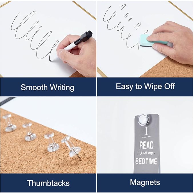 - PREMIUM QUALITY: This 16" X 12" small whiteboard set includes a dry erase board and corkboard. The magnetic whiteboard comes with a smooth surface, easy to clean up and write on. The bulletin cork board is equipped with premium durable cork, fits all variety of nails and pins without damage to the cork.