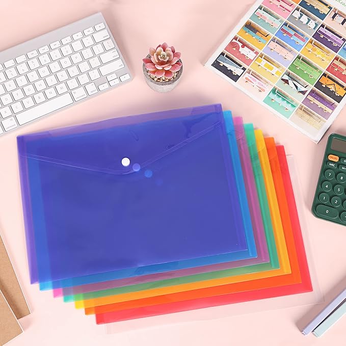 - Package Includes: 48pcs 8-color A4 size transparent poly folders with snap button closure.