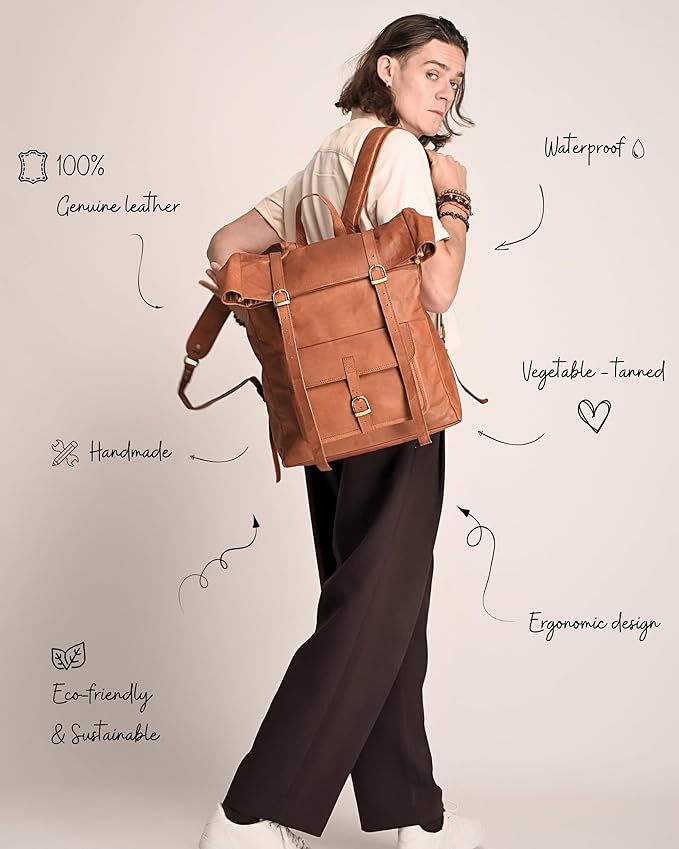 - GENUINE LEATHER - Crafted from full-grain, eco-friendly, vegetable-tanned goat leather produced from natural tanning instead of toxic chemicals, our genuine leather backpack exudes timeless style and sustainability.