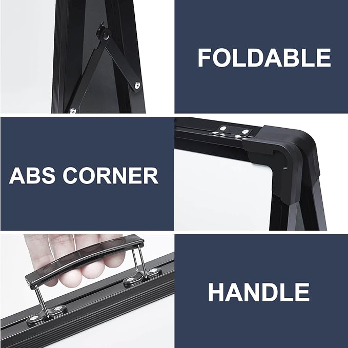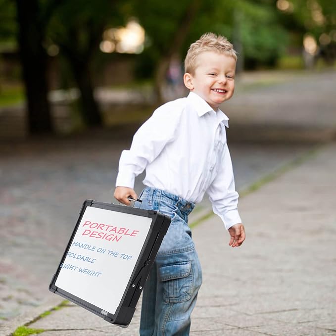 - STURDY AND PORTABLE - Double sided stand up small tabletop magnet dry erase whiteboard easel with solidly built but light weight. It is portable with a handle on the top for travelling.