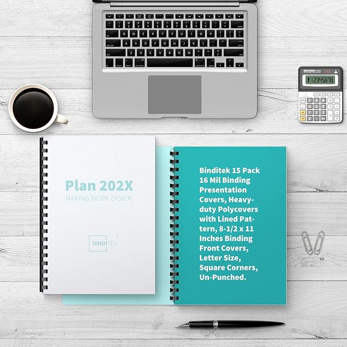 Binditek 15 Pack 16 Mil Binding Presentation Covers,Heavyweight Polycovers with Lined Pattern, 8-1/2 x 11 Inches Binding Front Covers, Letter Size, Square Corners, Un-Punched, Office Supplies