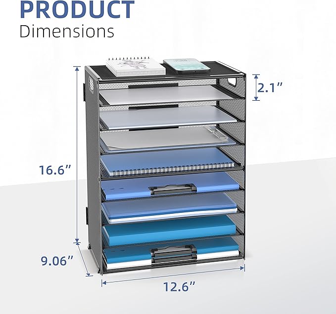 - [Perfect Paper Organizer] The 9-tier paper tray desk organizer has a large capacity for all your office supplies and accessories, such as: letters, paper, printing paper, books, folders, bills, magazines and so on. Keep your desk away from clutter and increase your productivity.