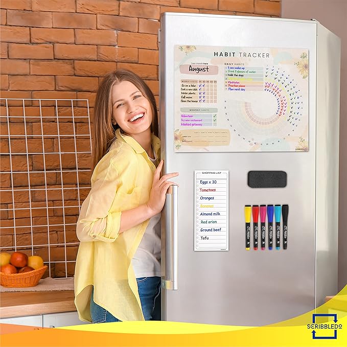 - π§² COMBO FRIDGE WHITEBOARD SET: Includes a 13βx17" magnetic habit chart and a magnetic shopping grocery list whiteboard for fridge. Six vibrant colored dry erase markers included. This combo dry erase magnetic whiteboard for fridge set fits most size refrigerators mini or full size, single door or side-by-side, super flexible and easy to use!