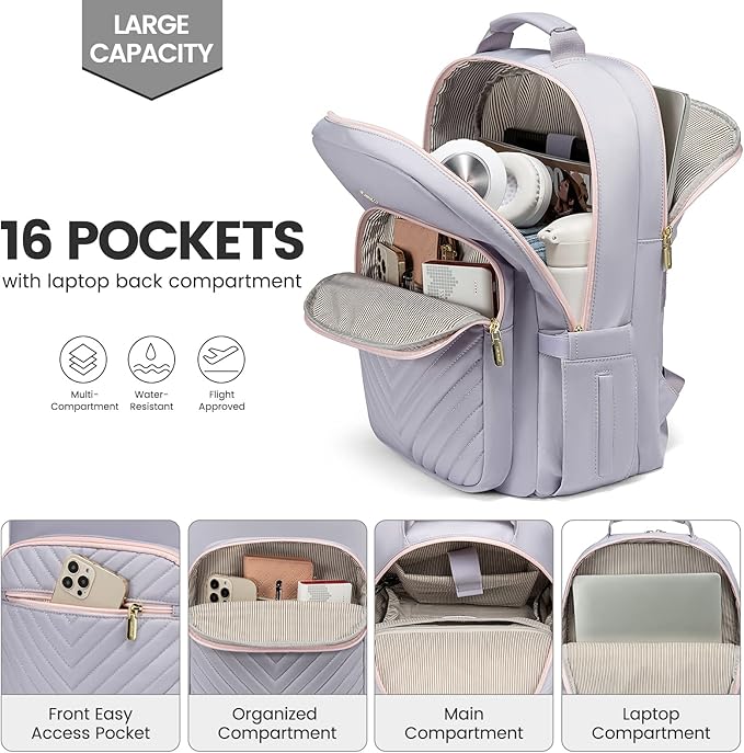 - 💯【Upgraded Laptop Backpack Women】: Classic V-shaped embroidery thread. Upgraded double LOVEVOOK no-slip metal zippers,water resistant Nylon fabric with polyester lining, ensures long lasting usage. Total of 4 compartments and 16 pockets for your computer,A4 folder,bottles,umbrellas,clothes,work supplies,college supplies and travel essentials.Dimensions: 12"L 19"H 7.8"D, Weight: 1.86lbs.