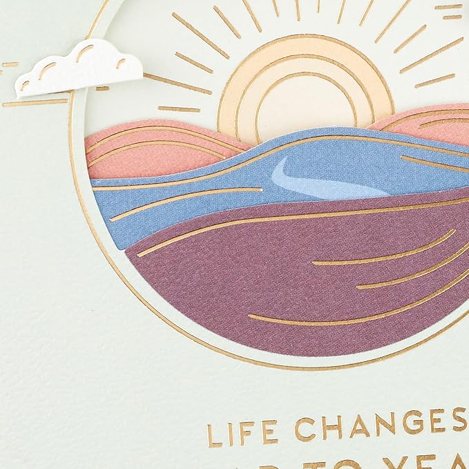 • Cover features a colorful design of the sun setting over the ocean, accented with gold foil. Message reads: "Life changes year to year. Love is for always."