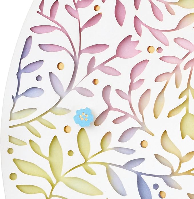 • Die-cut card in the shape of an Easter egg features detailed laser cut paper of leaves and flowers on a watercolor background.