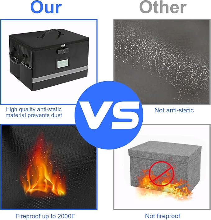 - HIGH QUALITY FIREPROOF FILING BOX: Fireproof lock box is made of double layered non-itchy silicone coated fiberglass which stands up the temperature up to 2000℉.It has been passed by SGS TEST(UL94 VTM-0 Certified). The design of High-quality 2 way zipper provides great convenience when using. The non-slip pad on the bottom makes the document box more durable and stable.