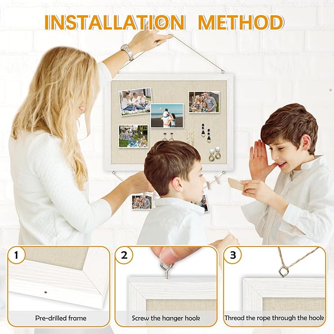 - 【Double-sided Linen Bulletin Board】 The cork board is made of high-fiber beige linen and white pattern frame. The self-healing ability of the linen makes the pin board repairable and durable. Double-sided linen surface enlarge the displaying space.