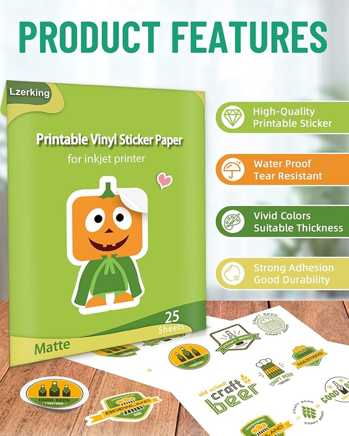 Lzerking Printable Vinyl Sticker Paper - 25 Sheets Matte White Self-Adhesive Waterproof Decal Printable Sticker Paper for Inkjet Printer - Standard Size 8.5x11 Inches DIY Crafts