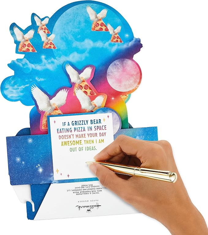 • Back of card reads: "If a grizzly bear eating pizza in space doesn't make your day awesome, then I am out of ideas," and includes space for a brief message.