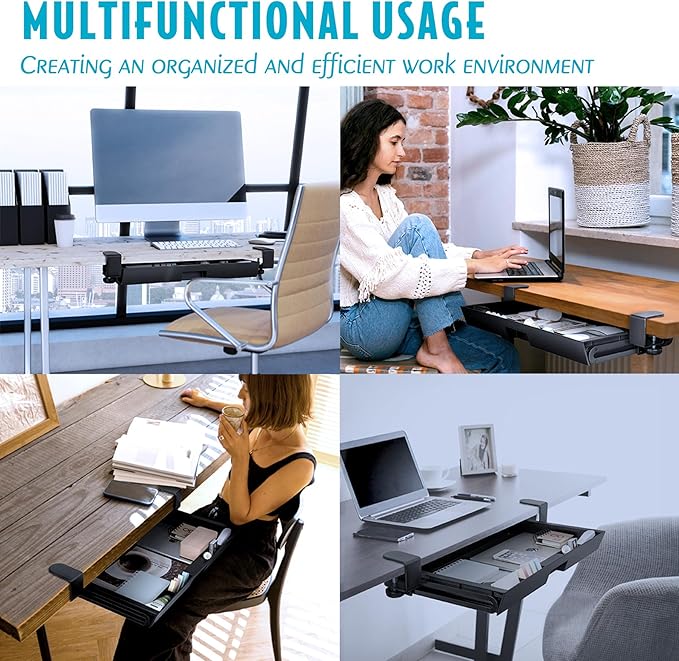 - 【C-Clamp Drawer Tray】Easily install the keyboard tray and attach it securely under your desk using the protective padded C-clamp, providing a secure and stable attachment without drilling and causing any damage to your desk.
