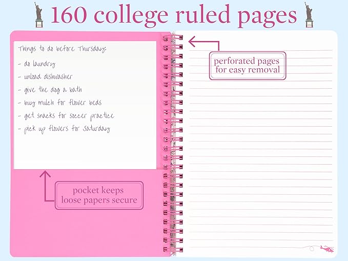 - INTERIOR POCKET: Features a durable hardcover with a colorful design featuring cities and their iconic features and a double sided storage pocket to keep loose notes organized
