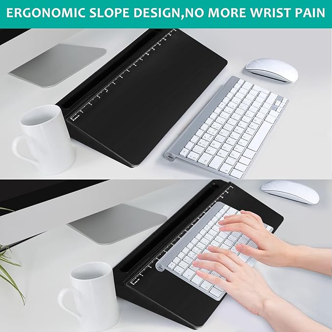 Desk Whiteboard Dry Erase Glass Whiteboard with 15“ Ruler Marker,Tilted Notepad Computer Keyboard Stand with Black Dry Erase Board Surface, Desktop White Board to-do List Memo Notepad,Black