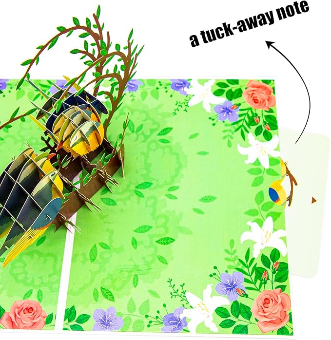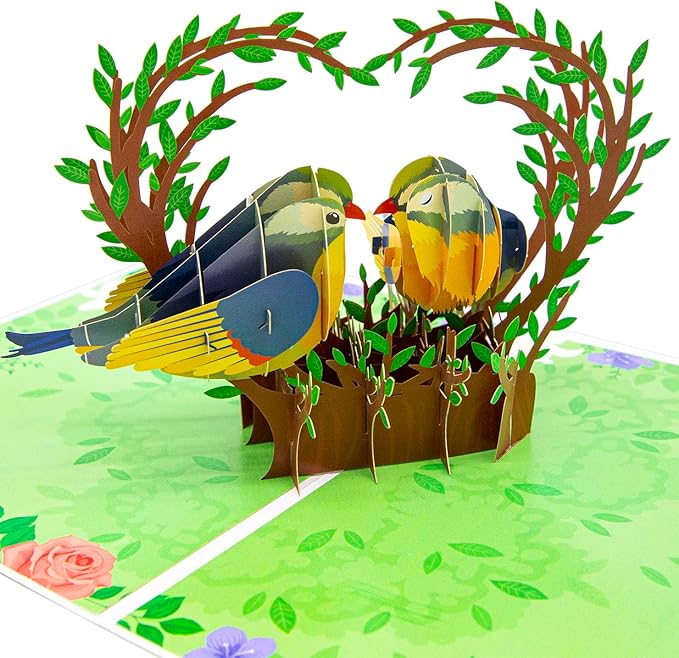 - [GORGEOUS DESIGN] On opening the card, a pair of winged messengers of happiness pop up in all their vivid colorful glory, perched beneath a heart-shaped branch, kissing affectionately face to face. Get this pair of love bird to someone you miss and they will understand your heart.