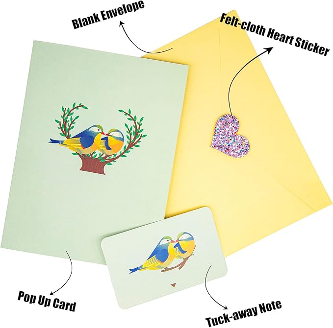 - [PACKAGING INCLUDED] 1 x 3D lovebirds card, 1 x tuck-away note card to write your warm wishes, 1 x high-grade butter-yellow envelope, 1 x felt-cloth heart sticker for sealing the envelope without spoiling its’ beauty.