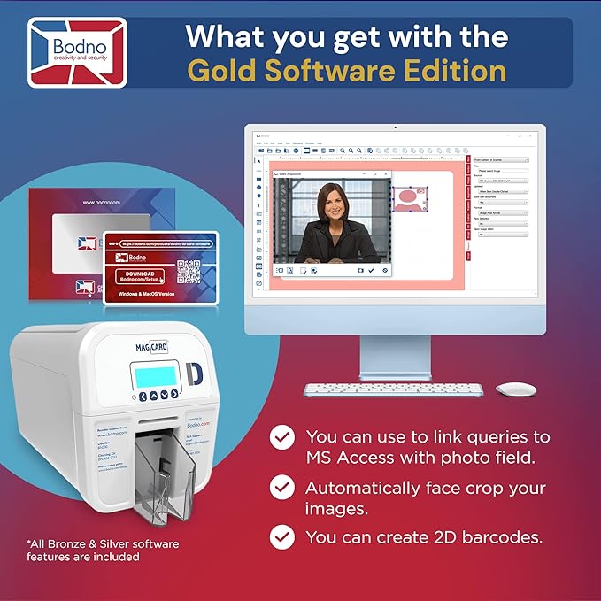 - BODNO GOLD EDITION SOFTWARE WITH ACTIVATION CODE: Say goodbye to USB sticks! The Gold Edition software includes all Silver features, plus advanced tools like 2D barcode printing and automatic face cropping, accessible via a secure activation code.