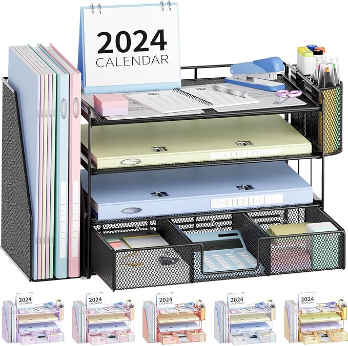 Desk Organizers and Accessories, Desk Accessories & Workspace Organizers for Office Supplies, File Organizer Desk Drawer Organizer with 2 Pen Holders, 4 Tier Paper Organizer for Desk(Black)