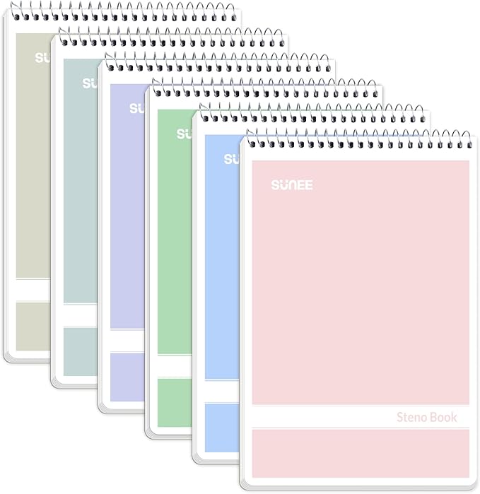 SUNEE Steno Pads 6x9 6 Pack, Gregg Rule, 60 Sheets, 6 Assorted Color Spiral Notebook 6x9, White Paper, Take Notes with Top Spiral Notebook, for School, University, College, Work, Office