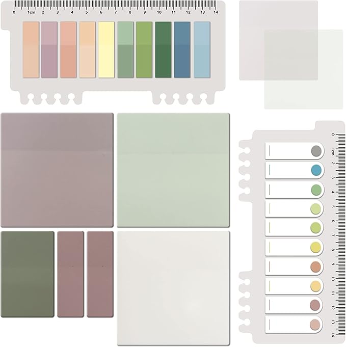 - Sufficient Quantity: 150 Sheets transparent sticky notes 3x3 inch, 50 Sheets translucent sticky notes 2.3x1.45 inch, 100 Sheets sticky notes 2.3x0.7 inch, 400 Sheets morandi pastel different colors book tabs 1.8x0.4 inch, enough to be used for a long time,Translucent sticky notes meet your various note-taking needs