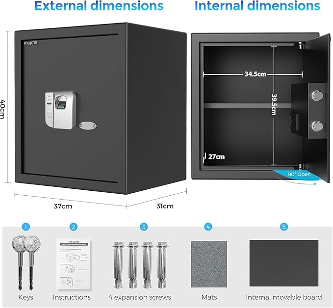 WASJOYE Fingerprint Biometric Safe Box, 2.0 Cu Ft Fireproof Safe Box with Finger Identification Key-Lock, Fingerprint Safe for Home Office Hotel Jewelry Document Passport Valuables Gun Safe Storage
