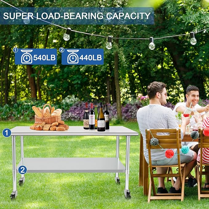 - 【VERSATILE USAGE】- Due to the strength and durability, our stainless steel prep table with wheels can be widely used in commercial kitchens, restaurants, laboratories, workshops, garages, outdoors.