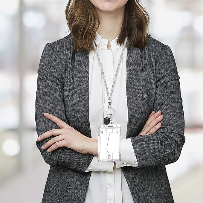 - Crystal Lanyard with Badge Holder. Our id lanyard is made of high-quality crystal beads, with 1 retractable badge reel clip and 1 clear id card holder can hold your keys & id card well, really sparkling and stylish.