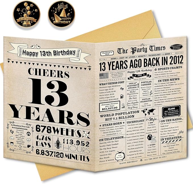 - 【Package Include】A 8 x 13 inches 13 year old birthday card and matching a gold envelope and transparent plastic bag to avoid damage to the greeting card. This special birthday card will be the talk of the party and make a great photo prop!