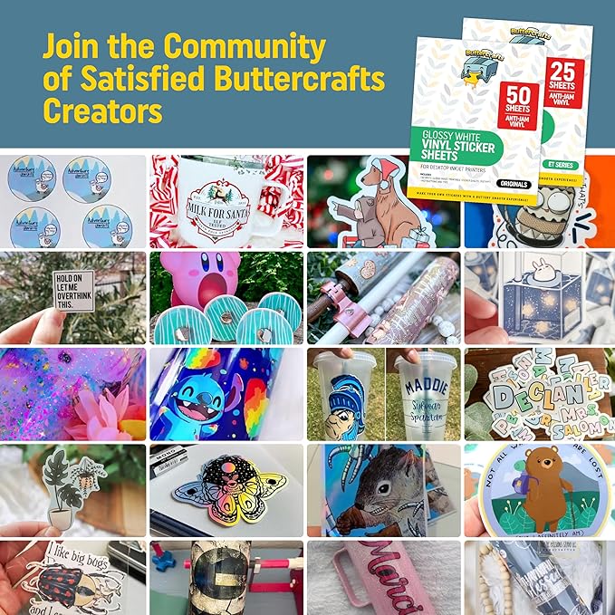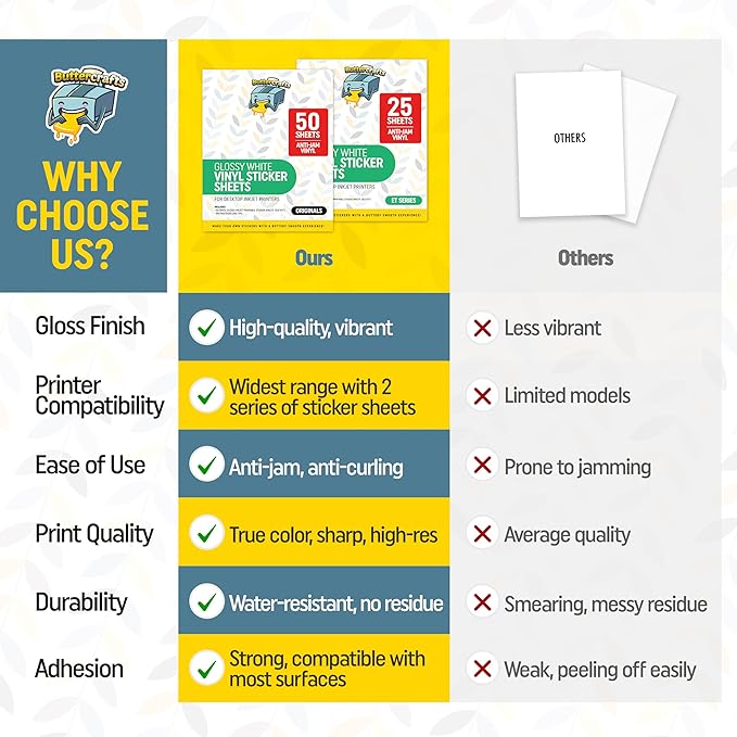 - BUTTERCRAFTS PREMIUM PRINTABLE STICKER PAPER - 25 Sheets / 8.5x11 / White Glossy Sticker Paper / Sticky Permanent Adhesive / Unbranded Backing Sheet / Works with most cutting machines