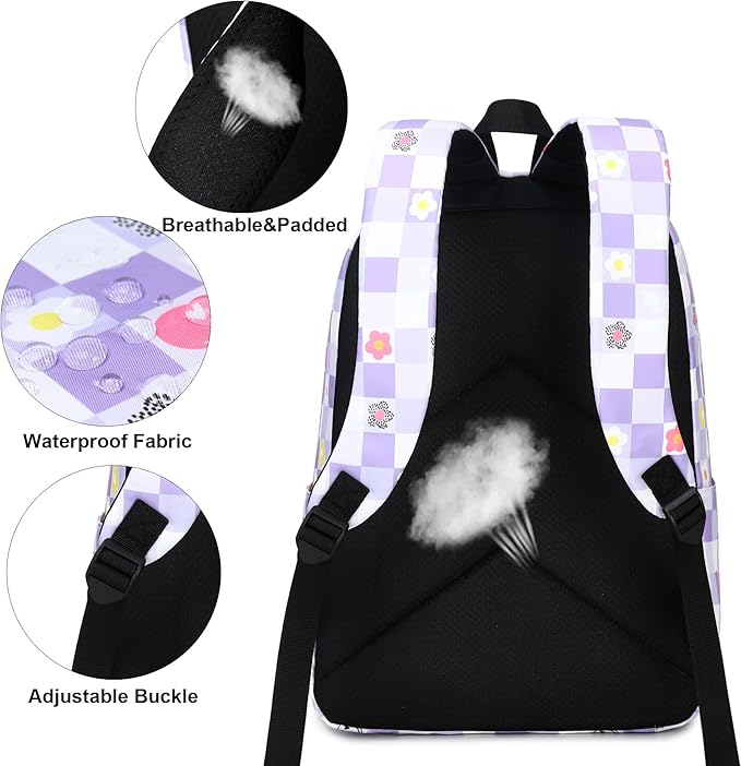 Flowers Checkered School Backpack for Teens Girls, Womens College Bookbags Kids School Bags Laptop Backpacks (Purple)