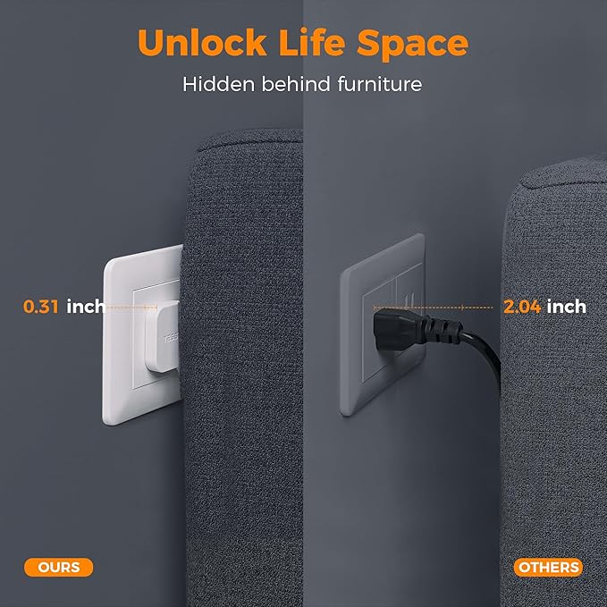 - Flat Extension Cord: With only 0.31 in ultra thin flat head design, extension cord flat wall plug can easily fit in tight spots and hide behind sofa, bed, nightstand or other furniture, sitting flush against the wall; 45 degrees right angle design creates an extra space for other plug below without blocking