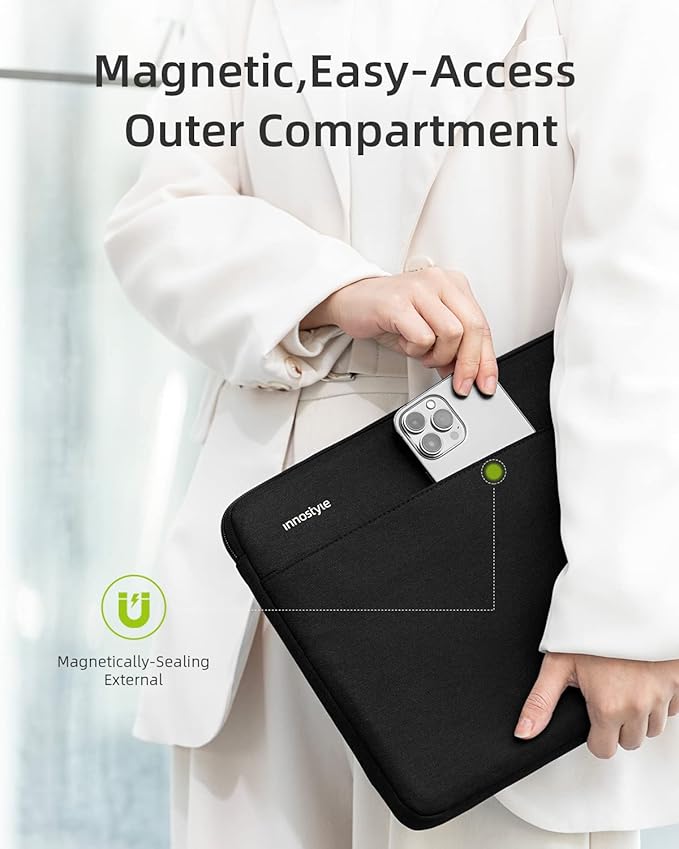 - Quick and Easy Access: The slim laptop sleeve with front pocket is designed to hold chargers, cables, mouse, external backup drives, and other essentials. With a magnetic-sealing closure, it is always within reach and convenience to use