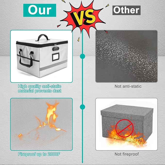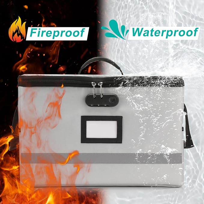 - HIGH QUALITY FIREPROOF FILING BOX: Fireproof lock box is made of double layered non-itchy silicone coated fiberglass which stands up the temperature up to 2000℉.It has been passed by SGS TEST(UL94 VTM-0 Certified). The design of High-quality 2 way zipper provides great convenience when using. The non-slip pad on the bottom makes the document box more durable and stable.