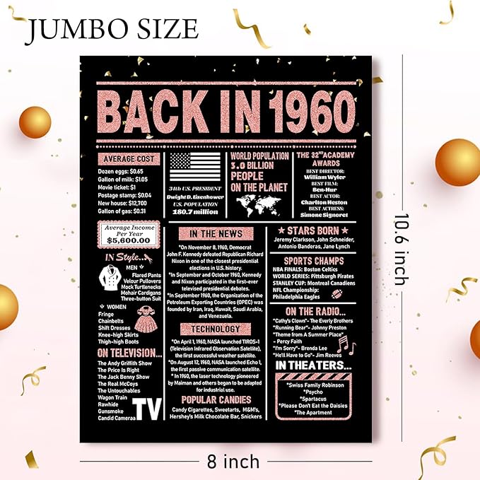 65th Birthday Card, 65th Birthday Gifts for Women, 65th Birthday Decorations for Her, Back in 1960 Birthday Card, Rose Gold