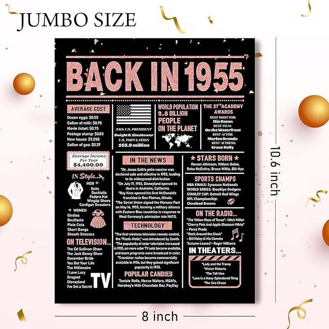 70th Birthday Card, 70th Birthday Decorations for Women, 70th Birthday Gifts for Mom, Back in 1955 Birthday Card, Rose Gold