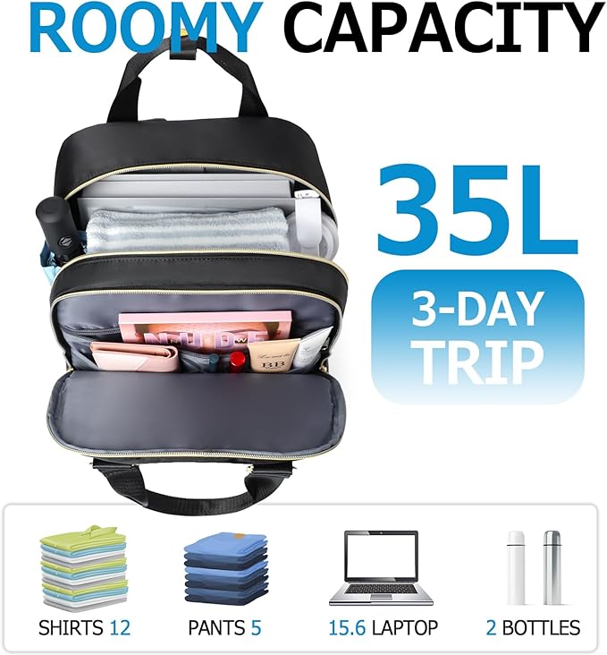 - Large Capacity & Multiple Pockets:18.1*12.6*7 inch, 35L. The laptop backpack has 4 large compartments and 2 side pockets. 1 padded laptop compartment can effectively protect the laptop. 1 main compartment can accommodate A4 folders, books, impurities and clothes. 2 front pockets and two side pockets can hold daily accessories such as mobile power supply, pen, passport, water bottle, umbrella, etc. Travel backpack keeps everything organized.