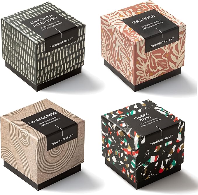 - THEME – LIVE WITH PURPOSE: Included in this pack are 4 boxes of ThoughtFulls - 1 box of Grateful, 1 box of Live with Intention, 1 box of Mindfulness, and 1 box of Carpe Diem. Every box features 30 cards, each with a unique quote to ground you. Share with a friend, family member, coworker, or anyone to encourage presence.