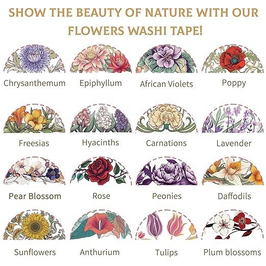 - [Rich Flowers]-34 rolls of washi tape printed with a selection of beautiful floral patterns including Sunflowers, Rose, Lavender, Poppy, Carnations, Peonies, Daffodils, Anthurium, Tulips, Epiphyllum, Plum blossoms, Violets, Hyacinths, Freesia. Each roll of flowers decorative tape is carefully selected by us to showcase the beauty of nature